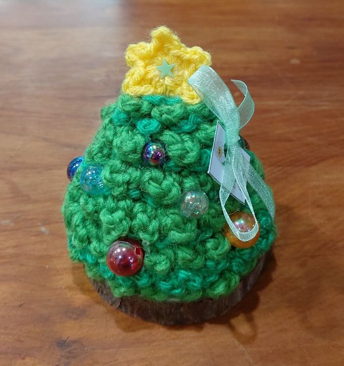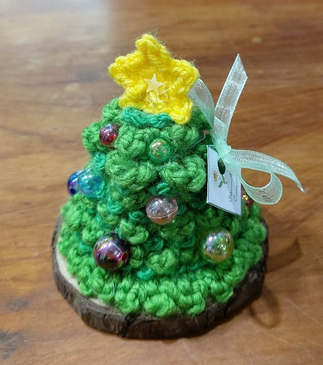 Alberello di Natale realizzato a mano all'uncinetto, con base in legno naturale, perline decorative colorate e stellina gialla all'uncinetto.