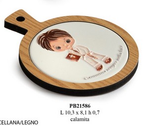 Bomboniere Comunione Taranto : Vassoio magnete Bimbo comunicando in porcellana-legno cm. 10,3. Il soggetto è ordinabile a gruppi di 24.