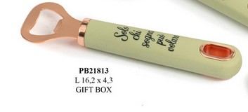 Bomboniere Matrimonio Brescia : Apribottiglie color rame in metallo-plastica verde cm. 16,2 con astuccio. Il soggetto è ordinabile a gruppi di 3.