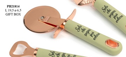 Bomboniere Matrimonio Brescia : Tagliapizza color rame in metallo-plastica verde cm. 19,5 con astuccio. Il soggetto è ordinabile a gruppi di 3.