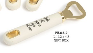 Bomboniere Matrimonio Milano : Apribottiglie color oro in metallo-plastica bianca cm. 16,2 con astuccio.Il soggetto è ordinabile a gruppi di 3.