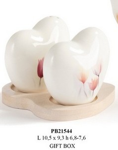 Bomboniere Matrimonio Roma : Set Sale e Pepe a cuore su vassoio in porcellana-legno cm. 10,5 con astuccio.Il soggetto è ordinabile a gruppi di 4.