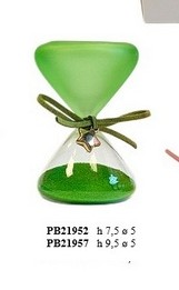 Bomboniere Nozze d'Oro Sardegna : Clessidra verde satinata stella oro cm. 7,5 in vetro-metallo con astuccio. Il soggetto è ordinabile a gruppi di 6.
