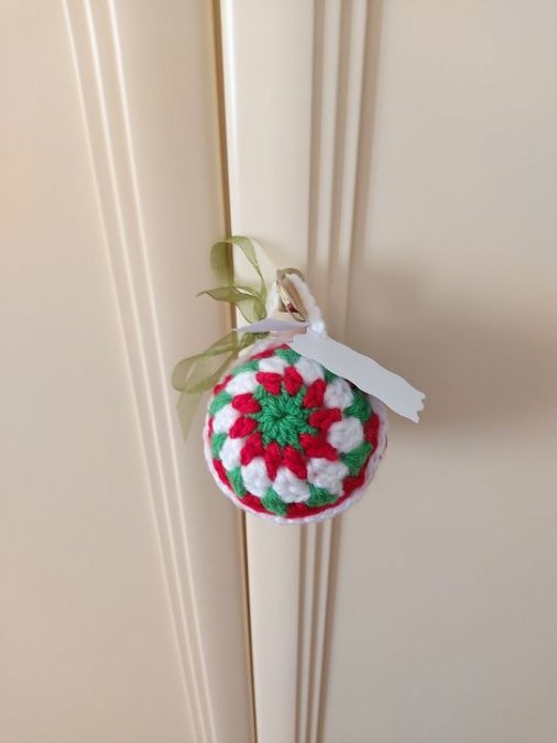 Pallina Natalizia fatta a mano all'uncinetto in stile granny e personabilizzabile nel nome. Colori bianco/verde/rosso.