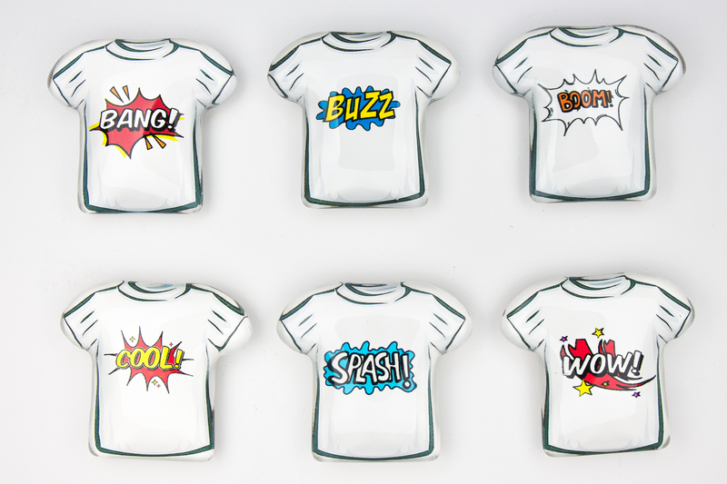 Bomboniere 18° Compleanno Lucca : Scritta fumetti magnete 5 x 5 cm. Il soggetto è ordinabile a gruppi di 16 e sono 6 assortiti.