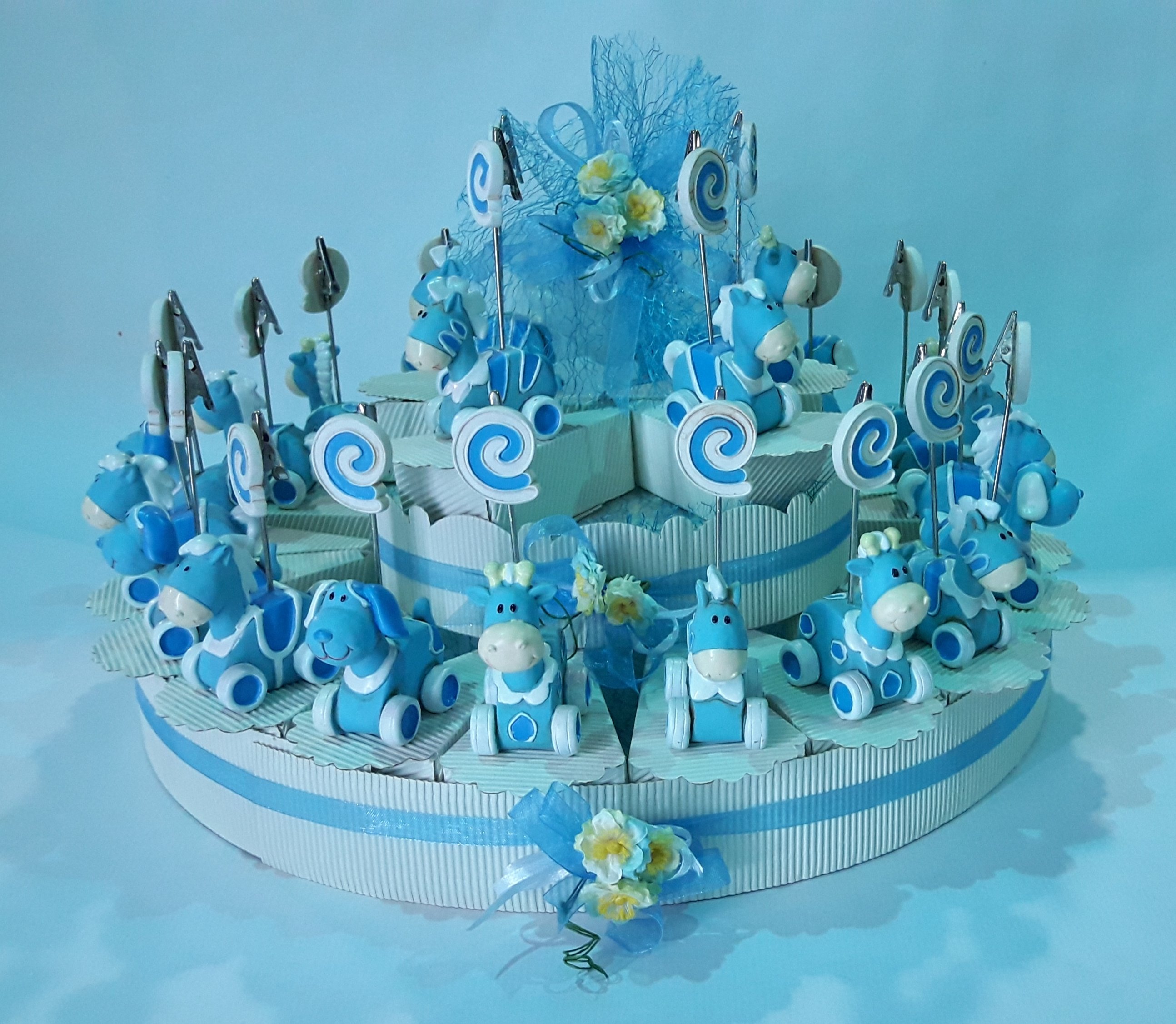 Bomboniere Battesimo : Torta Cavallini celesti memoclip assortiti composta da 24 fette con 5 confetti all'interno, rifinitura ai 2 piani della torta, un canino memoclip su fetta + confezione + una mucchina su fetta nella parte centrale. I soggetti disponibili sono 24.