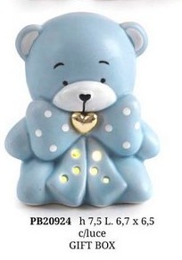 Bomboniere Battesimo Trentino Alto Adige : Orsetto seduto con fiocco celeste con luce in porcellana cm. 7,5 con astuccio. Il soggetto è ordinabile a gruppi di 3.