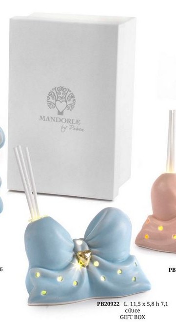 Bomboniere Battesimo Trentino Alto Adige : Profumatore Fiocco celeste con luce in porcellana cm. 11,5 con astuccio. Il soggetto è ordinabile a gruppi di 2.