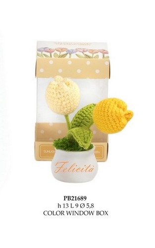 Bomboniere Comunione Liguria : Vasetto tulipani gialli lavorati a maglia cm 13 in lana-plastica con astuccio. Il soggetto è ordinabile a gruppi di 4.