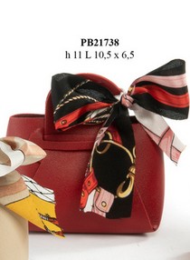 Contenitore x confetti borsetta rossa con fiocco cm. 11 in stoffa completa di 5 confetti all'interno e bigliettino Matrimonio STAMPATO. Il contenitore x confetti borsetta con fiocco è ordinabile a gruppi di 24.