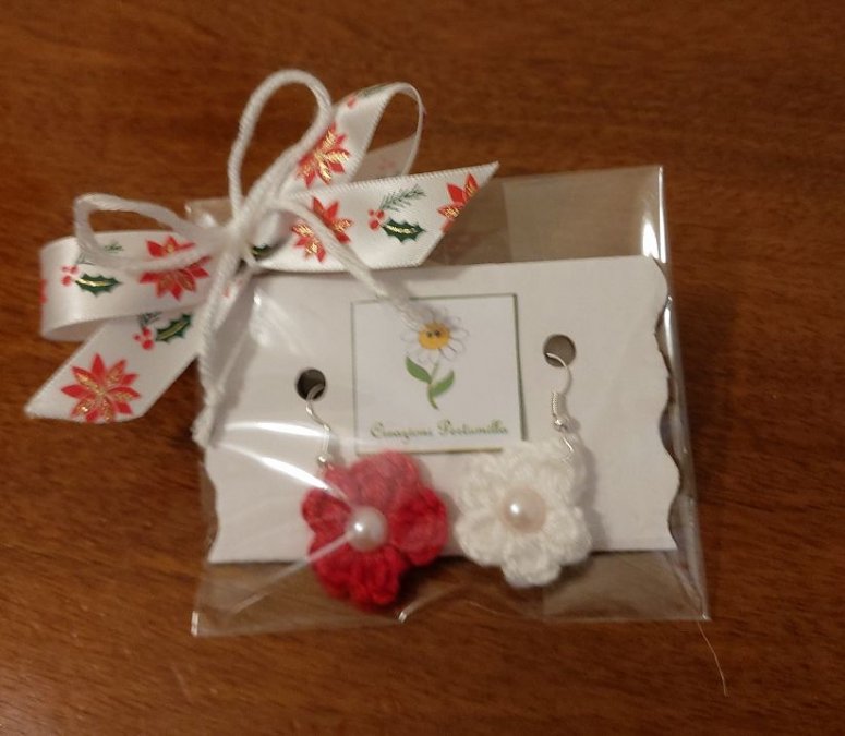 Orecchini artigianali fatti all'uncinetto a forma di piccolo fiore con perla al centro.
