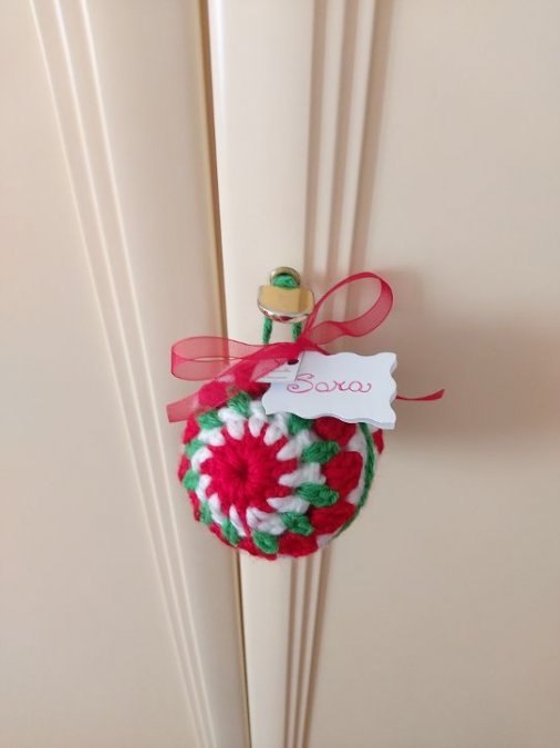 Pallina Natalizia fatta a mano all'uncinetto in stile granny e personabilizzabile nel nome. Colori bianco/verde/rosso.