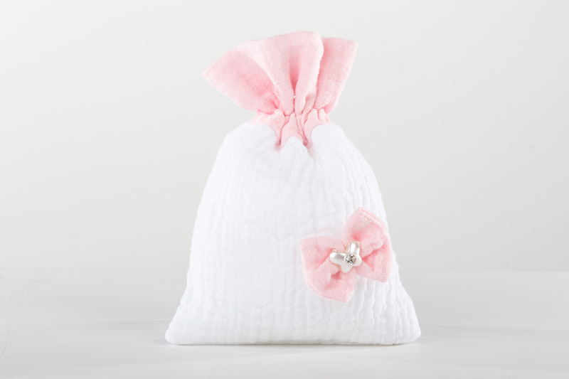Sacchetto farfalla rosa 10 x 14 cm con 5 confetti all'interno e bigliettino Comunione STAMPATO. Il soggetto è ordinabile a gruppi di 10.