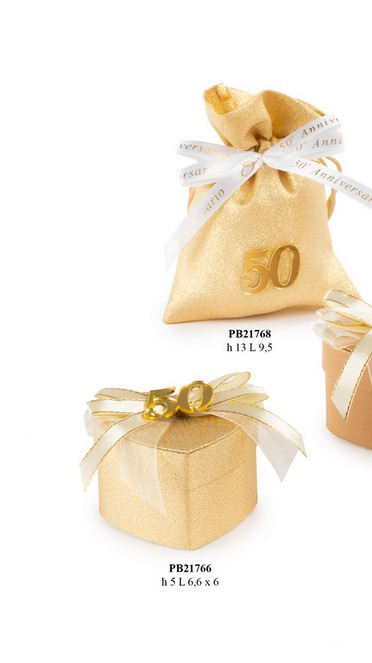 Trento Bomboniere Nozze d'Oro : Sacchetto x confetti NR. 50 oro in stoffa-plastica cm. 13 con 5 confetti all'interno e bigliettino Nozze d'Oro STAMPATO. Il soggetto è ordinabile a gruppi di 60.